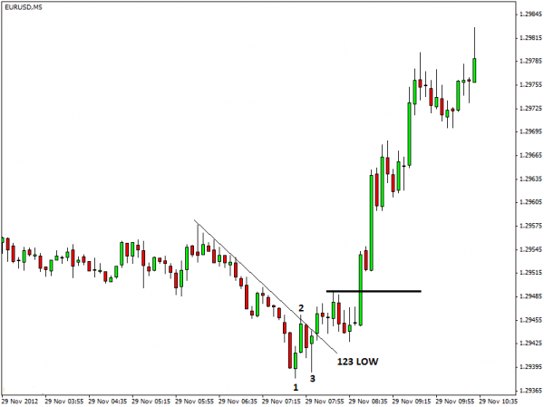 Il pattern 123 Low, come si può vedere anche nell’immagine, ha un momento in cui la spinta ribassista sembra esauritasi. Dopo questo momento di picco i compratori cominciano ad alimentare il mercato, partecipando quindi alla spinta del rialzo.