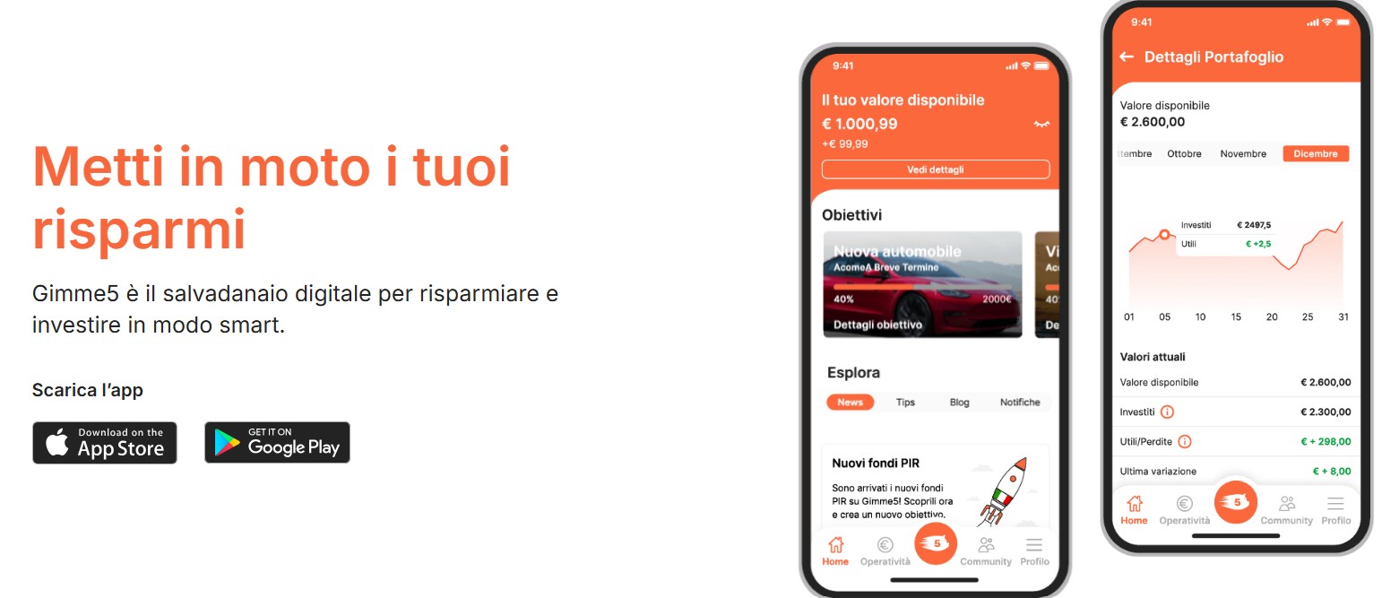 Gimme5 è la prima app italiana nel settore del risparmio che offre un salvadanaio digitale e la possibilità di investire in fondi comuni di investimento a partire da 1 euro.