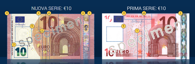 Le nuove caratteristiche di sicurezza sono state immesse tutte sul fronte della banconota: il ritratto della principessa Europa nella filigrama e nell’ologramma; il numero 10 in verte smeraldo che cambia colore diventando blu scuro, i trattini in rilievo sui margini.