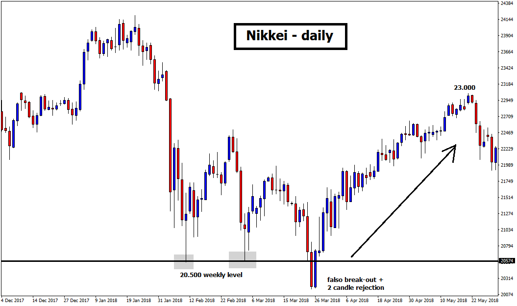 Per comprendere meglio questo pattern andiamo ad esaminare il grafico daily del Nikkei, tramite un suo suo CFD, che mostra un evidente segnale di inversione del trend a partire da un weekly level molto importante posto in area 20.500 punti. La formazione del 2 candle rejection è associato a un netto falso break-out del supporto. Il segnale bullish è servito: i prezzi saliranno con decisione nei giorni successivi e in meno di due mesi la quotazione raggiungerà i 23.000 punti.