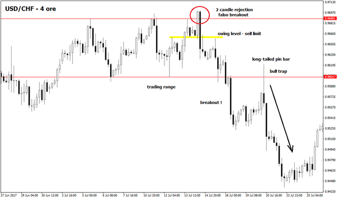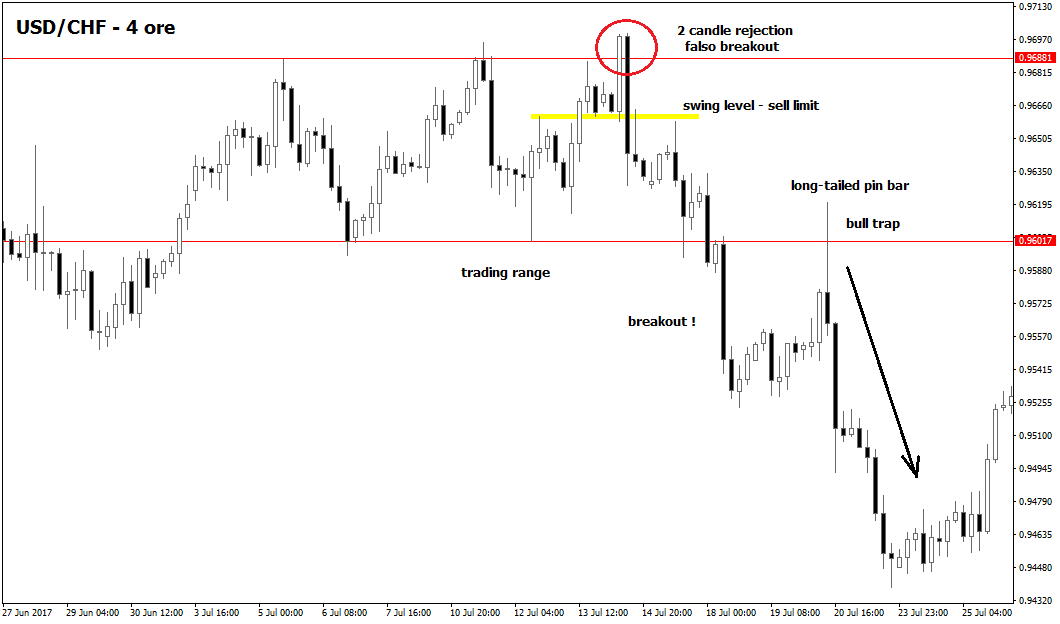 Grazie alle tipiche bull trap e bear trap è possibile comprendere meglio la struttura di mercato e dare maggior valenza al segnale candlestick (sia esso a una sola candela o a due candele). La presenza di un falso breakout non è fondamentale, ma se c’è tanto di guadagnato in termini di accumulo delle probabilità a proprio favore. Andiamo a vedere ora un esempio pratico, che ci porta al tasso di cambio Dollaro americano su Franco svizzero (USD/CHF), time frame a 4 ore.