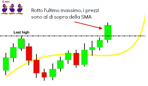 Per una conferma extra puoi aspettare che il prezzo rompa al rialzo l’ultimo picco sul grafico a 5 minuti: ciò significa che i prezzi avranno superato la SMA 60 su tutti e tre i timeframe e così le tre Duck saranno allineate nella stessa direzione (a quel punto, "le papere sono allineate").
