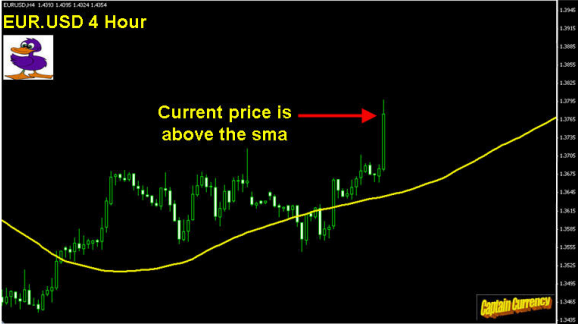La prima cosa da fare è osservare la situazione dal maggiore time-frame che hai a disposizione: il grafico a quattro ore). Dove si colloca il prezzo rispetto alla SMA 60? Se il grafico dice che il prezzo è al di sopra della media mobile a 60 periodi, allora dovrai iniziare a pensare di comprare, viceversa dovrai pensare ad una posizione short.