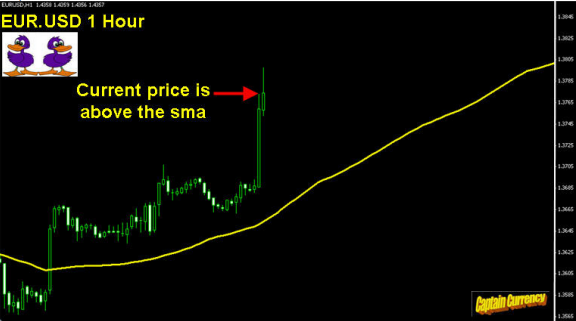 La seconda cosa da fare è aprire il grafico a un’ora. Perché il segnale della prima duck sia confermato, anche in questo caso è necessario che la posizione del prezzo corrente sia superiore alla SMA a 60 periodi.