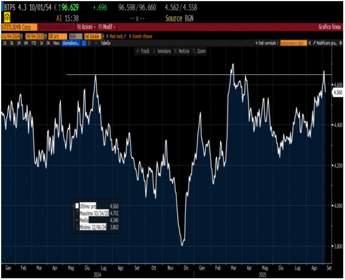 Ma indubbiamente il mercato negli ultimi giorni ha esagerato nella svendita dei bond a lungo termine, e lo ha fatto su basi anche “emotive”, come potete vedere dal grafico Bloomberg del rendimento del BTP a 30 anni nel 2024-2025. Tale rendimento, allorquando raggiunge la soglia del 4,65% (linea orizzontale del grafico), provoca correnti di riacquisto del bond, facendo scendere di nuovo il tasso a scadenza al di sotto di tale soglia.