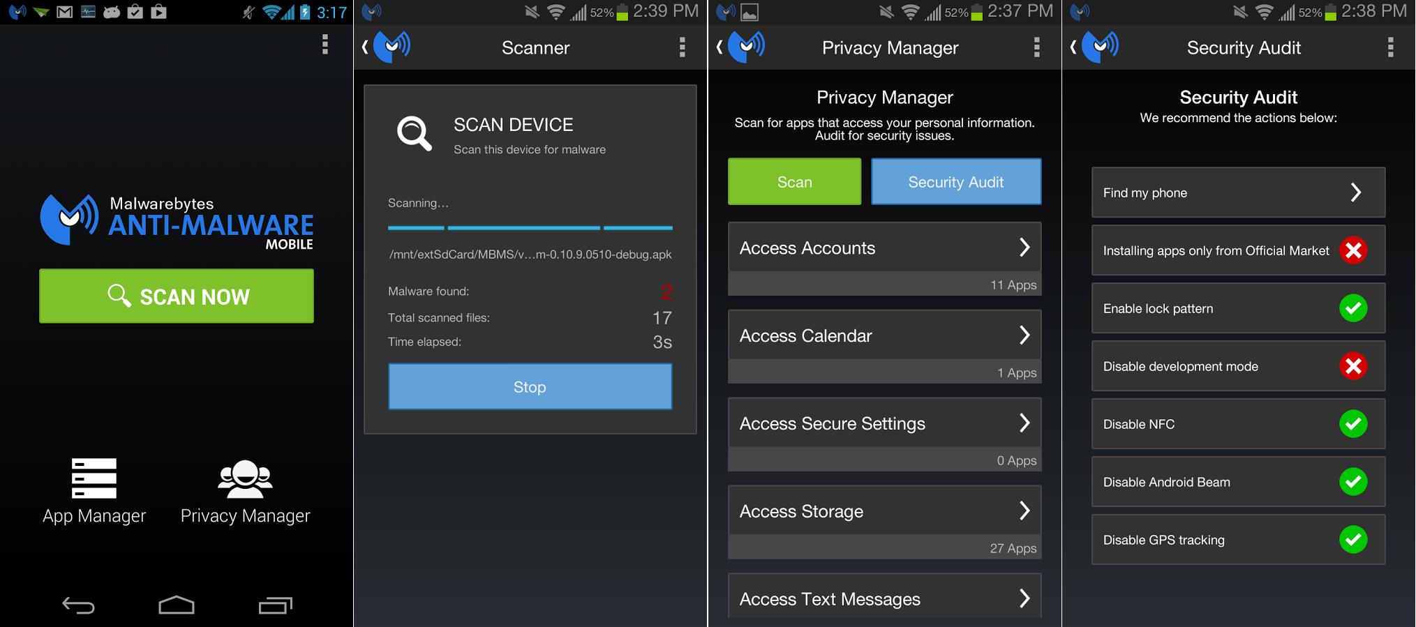 Se quello che più vi preoccupa non è il furto o smarrimento del vostro dispositivo, Malwarebytes offre tra gli strumenti migliori per la protezione da malware e applicazioni infette. Una scansione in tempo reale e sempre attiva vi notificherà di qualsiasi problema, malware, spyware, trojans o codice nocivo con cui il dispositivo è venuto in contatto.