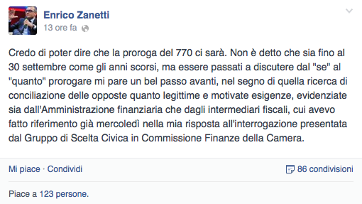 A cambiare nuovamente la carte in tavola è arrivato, ieri sera, un nuovo commento del Sottosegretario all’Economia Zanetti sul tema del 770. Sul sul profilo Facebook infatti è apparso il seguente messaggio: