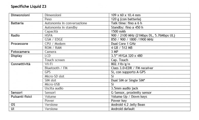 Queste alcune delle principali caratteristiche del Liquid Z3 illustrate anche nella tabella riportata sotto: