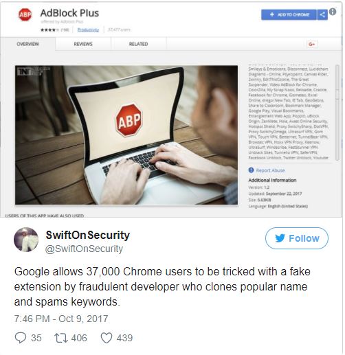 Un’estensione fake di Adblock Plus per Chrome è apparsa nel Web Store ufficiale di Big G ed è stata scaricata da 37.000 utenti. A lanciare l’allarme è stato l’account Twitter @SwiftOnSecurity, che ha notato un’estensione falsa del noto servizio per bloccare la pubblicità sui siti. L’utente spiega che Adblock Plus fake è stato creato “da uno sviluppatore fraudolento che clona il nome e le parole chiave del popolare servizio così da rendere piuttosto difficile scoprire il tranello dal momento che il nome resta Adblock Plus e si trovano tante recensioni”.