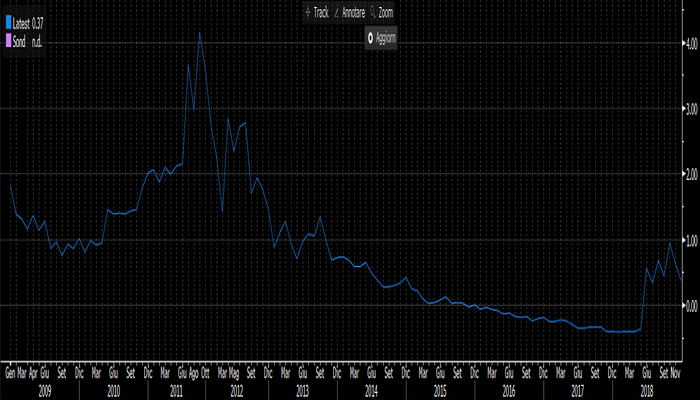 Andamento dei rendimenti del BOT a scadenza annuale dal 2009. Fonte: Bloomberg