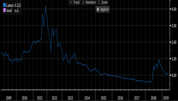 Nell’ultimo collocamento infatti, lo yield del 12 mesi dell’Italia ha messo in pausa il suo percorso discendente, passando dallo 0,07% allo 0,2162%. Se questa dinamica dovesse divenire la regola, e non l’eccezione, si avrebbe una panoramica più chiara relativamente alla crescente quota di rischio che gli investitori attribuiscono al nostro Paese nel breve periodo.