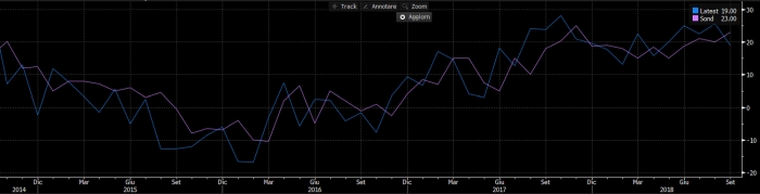 Gli analisti censiti da Bloomberg si attendono quindi un leggero recupero dell’attività manifatturiera regionale, dopo il rallentamento registrato nel mese di settembre. Il dato rivelatosi nella precedente lettura ha infatti deluso le aspettative degli analisti che stimavano a 23 punti contro i 19 punti effettivi.