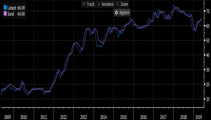 Dopo una contrazione durata per tutto il 2018 che lo aveva portato ai minimi da maggio 2015 a 56 punti, il dato ha iniziato una ripresa solida, spesso sorprendendo in positivo le attese degli analisti.