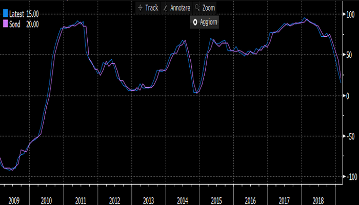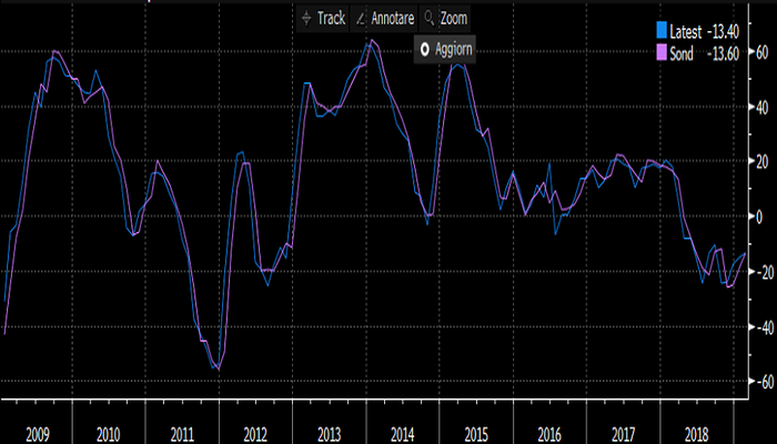 Per quanto riguarda il dato sulla situazione corrente, gli analisti censiti da Bloomberg si attendono una lettura in contrazione a 13 punti contro i 15 punti di febbraio. Da gennaio 2018, quando l’indice è arrivato ai suoi massimi da oltre 10 anni, a 95,20 punti, è iniziata una feroce contrazione che lo scorso mese lo ha portato ai minimi da dicembre 2014.