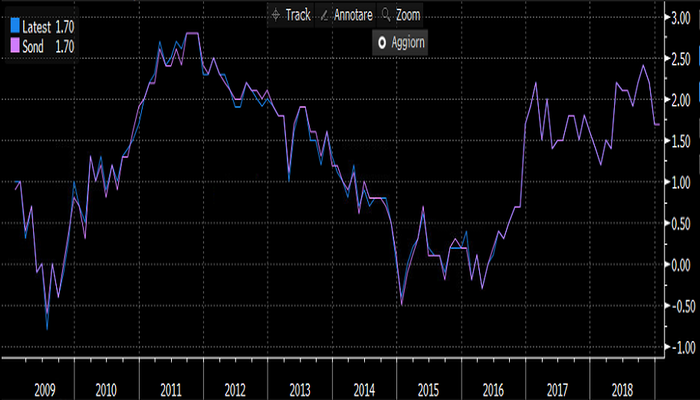 Durante il 2018, questo indice ha raggiunto i minimi dal dicembre 2014 per poi tentare una timida ripresa lo scorso gennaio. Pur restando sopra la soglia critica dei 50 punti, l’indice segnala un costante peggioramento del comparto manifatturiero tedesco.