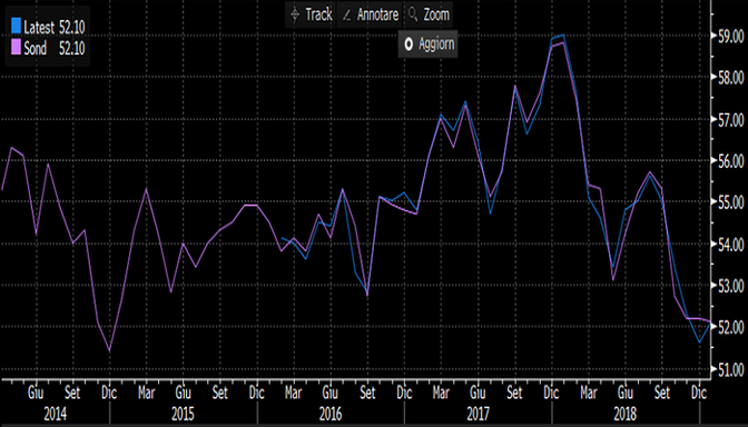 Per Eurozona, gli esperti censiti da Bloomberg sono più ottimisti: il dato composito dovrebbe infatti segnare a febbraio una timida ripresa a 51,1 punti contro i 51 di gennaio 2019.