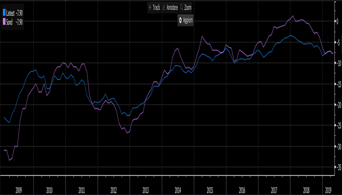 Nel corso del 2018, questo indicatore ha iniziato un percorso discendente che lo ha portato a segnare a dicembre i livelli più bassi da marzo 2017. Nei primi mesi del 2019 poi, questo indicatore ha messo in piedi una leggera ripresa, evidenziando una lieve aumento della fiducia dei consumatori.