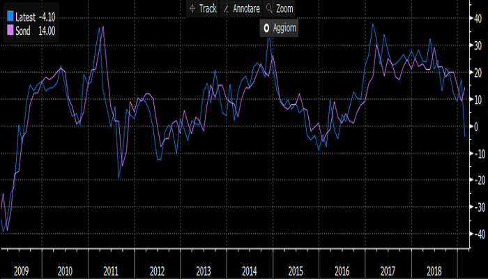 Lo scorso febbraio, il dato ha ampiamente deluso le attese degli esperti, con l’indice che ha toccato i valori minimi da maggio 2016. Per questo mese, gli analisti si attendono una lettura in deciso aumento a 4,8 punti, contro i -4,1 precedenti.
