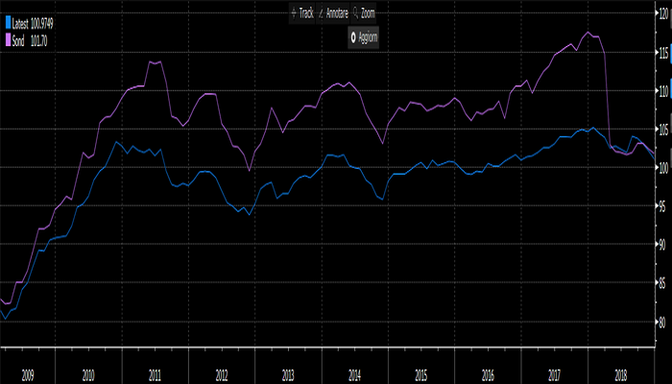 Gli analisti censiti da Bloomberg si attendono un dato in contrazione a 100,7 punti rispetto ai 101 di dicembre, quando si è avuto la peggiore rilevazione da fine 2016.