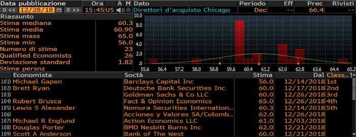 Nel grafico la distribuzione delle stime raccolte presso 26 analisti delle maggior banche d’affari negli Usa; fonte: Bloomberg