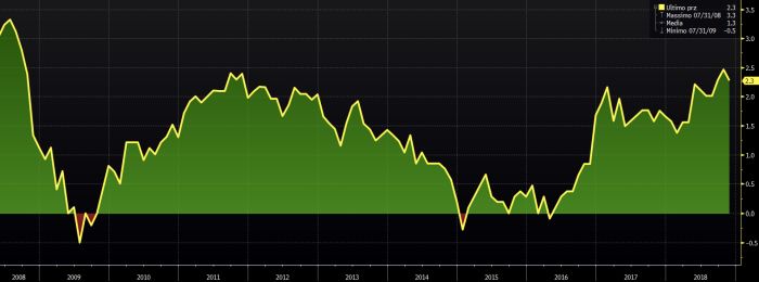 Nel grafico l’andamento dell’indice CPI su base annua in Germania; fonte: Bloomberg