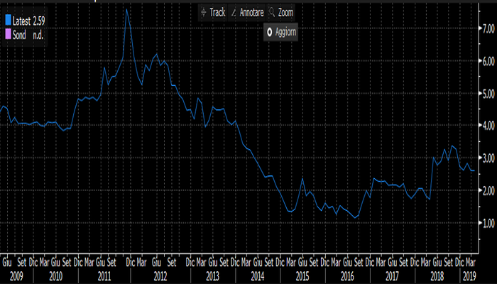 Negli ultimi collocamenti, gli yield della scadenza decennale hanno evidenziato comunque una diminuzione, passando dal 3,36% dell’emissione del 30 ottobre 2018 al 2,59% dell’ultima asta.