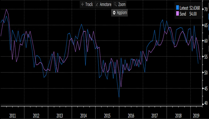 Da febbraio, questa misurazione ha iniziato un percorso fortemente discendente, fino a portarsi ai minimi dal gennaio 2017, pur restando sopra la soglia dei 50 punti, che separa la contrazione dall’espansione del settore manifatturiero. Nelle ultime misurazioni, le letture effettive dell’indice hanno sorpreso in maniera negative le attese degli esperti.
