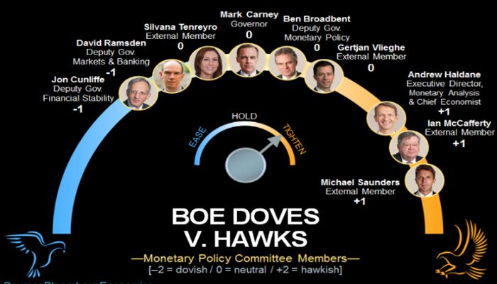Come si può osservare dall’immagine in pagina, al momento l’ago della bilancia è favorevole ai “falchi” all’interno del board della Bank of England, che avrebbero la maggioranza grazie all’apporto dei due membri esterni, Ian McCafferty e Michael Saunders.