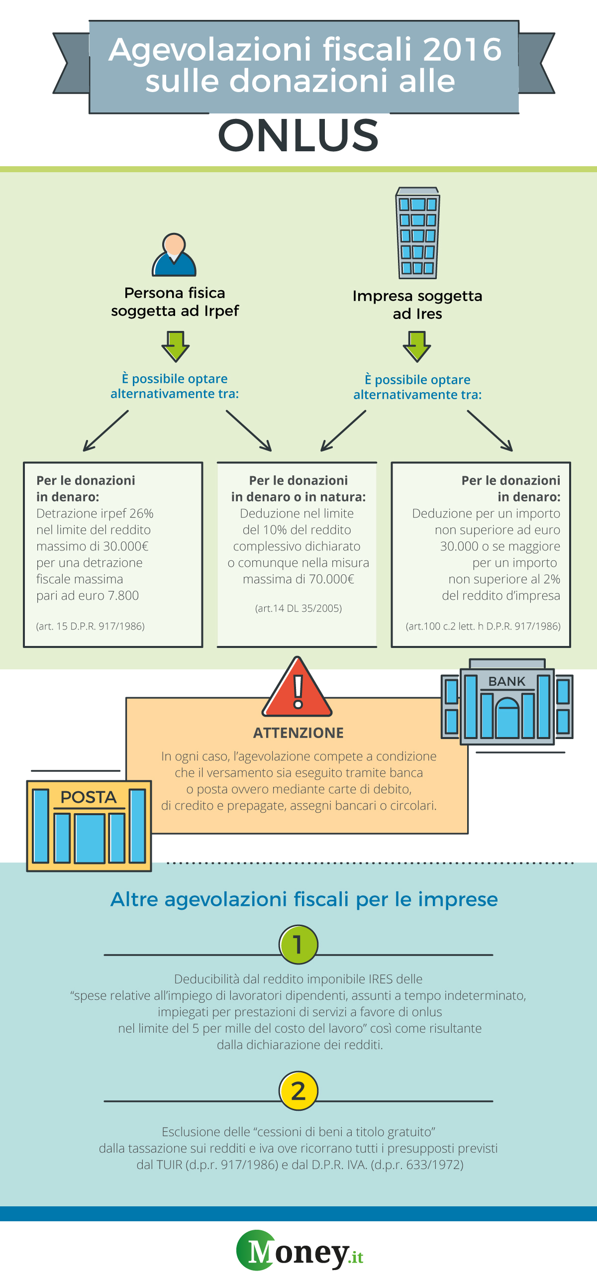 Nel frattempo i lettori possono utilmente fare riferimento alla seguente infografica che sintetizza le principali agevolazioni fiscali 2016 sulle donazioni corrisposte da persone fisiche e imprese a favore delle ONLUS: