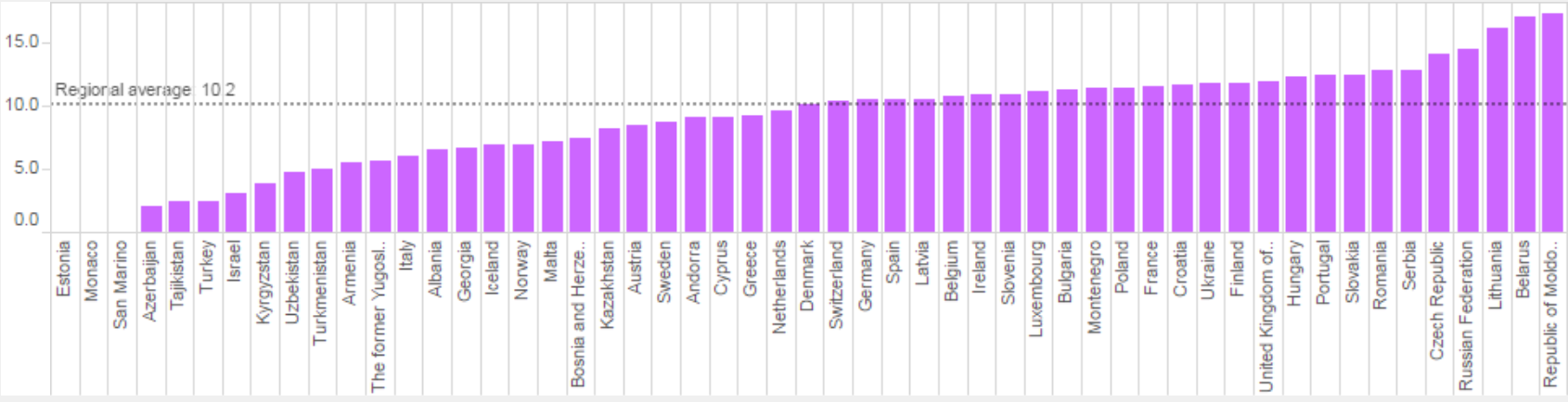 L’Olanda, il Paese di Dijsselbloem, non rende noti i propri dati sul consumo di alcol e prostituzione: anche qui Eurostat li classifica come “confidential” (ciononostante il servizio statistico rende comunque note le medie per la UE-28 e dunque prima abbiamo ragionato su questi dati). Disponiamo però dei dati sull’alcol da un’altra fonte: l’Organizzazione Mondiale della Salute (OMS).