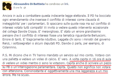 Era arrivato a diventare una delle facce del Movimento 5 Stelle più conosciute (Grillo a parte), fronteggiando telecamere e cronisti con decisione e dialettica da politico consumato. Proprio come un politico consumato Alessandro Di Battista alla fine cade su un dettaglio: durante le votazioni sulla legge elettorale di questa mattina si è fatto "pizzicare" mentre guardava una partita di calcio in streaming, propabilmente gli hi-lites della Champions League di ieri sera.