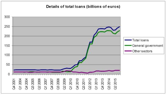 Per quanto riguarda la prima voce, vediamo che, dal 2010 aumentano significativamente i prestiti contratti dal governo greco.