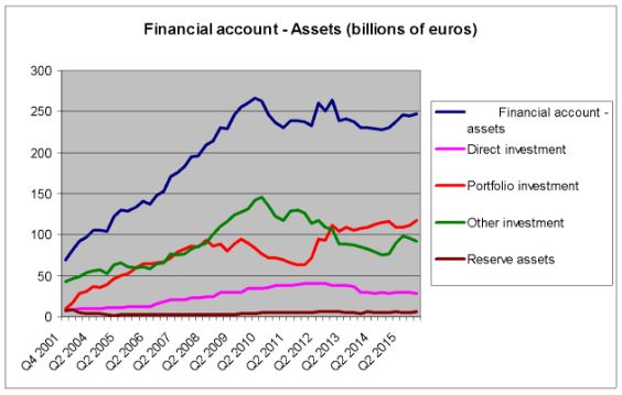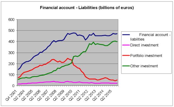 Dal grafico sotto riportato si nota che, a partire dal 2010, in modo quasi speculare, sono aumentati gli “altri investimenti” (other investment) e sono diminuiti gli “investimenti di portafoglio” (portfolio investment).