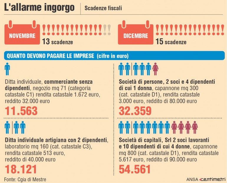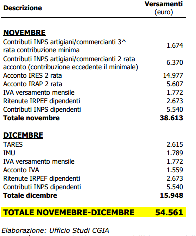 Le scadenze fiscali di novembre e di dicembre metteranno a dura prova le finanze delle imprese. Pensate che, secondo i calcoli della CGIA, l’ammontare della spesa per una Srl con 12 addetti supererà i 54.500 euro. Quali sono le imposte che contano di più in questo ingorgo fiscale?