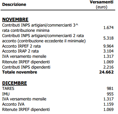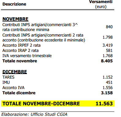 - SOCIETA’ DI CAPITALI, Srl 2 soci lavoranti e 10 dipendenti di cui 4 donne, capannone mq 800 (cat. catastale D1), rendita catastale 5.617 euro, reddito di 90.000 euro: tra novembre e dicembre dovrà versare 54.561 euro.