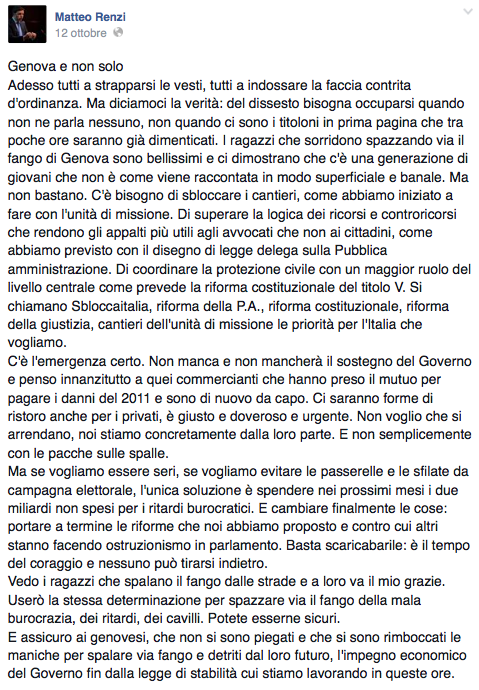 Home > Altro > Archivio > Alluvione Genova: Renzi informato dei rischi ad agosto. Nessuna risposta (…)