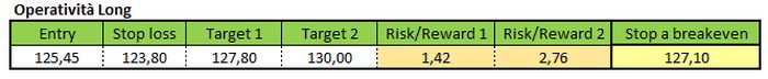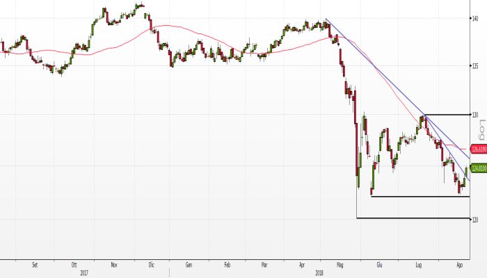 Probabilmente, se la positività della seduta odierna dovesse essere confermata in chiusura di contrattazioni, questo favorirebbe un ingresso di ulteriori forze rialziste, ma i tori dovranno difendere quota 124,32 euro, livello statico ereditato dal minimo segnato il giorno 26 giugno, per vedere confermata la loro forza.