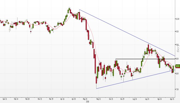 Lo stop loss potrebbe essere posizionato sul livello di apertura della seduta di venerdì a 8,15 euro. Nel caso di un’operatività di natura rialzista, bisognerà prestare attenzione alla trendline discendente ora transitante a 8,60 euro, che conta il massimo segnato nella prima decade di maggio a quota 10,39 e il massimo a quota 9,05 euro, della seduta del primo agosto scorso.