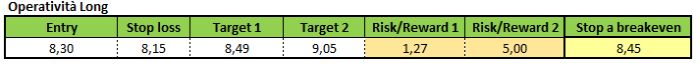 Alla luce dell’analisi tecnica sul titolo si priviliegia un’operatività di tipo long alla rottura del livello del massimo della barra di giovedì scorso a 8,30 euro, con primo obiettivo il livello statico a 8,49 euro che ha disegnato la parte superiore dell’area di consolidamento delle quotazioni da maggio a fine luglio. Un obiettivo più ambizioso potrebbe essere identificato a quota 9,05 euro, massimo segnato con la seduta del primo agosto scorso.