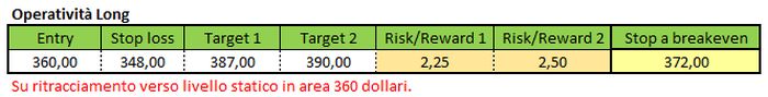 Alla luce di quanto emerso dalla struttura tecnica si vuole privilegiare un’operatività di tipo long in caso di ritracciamento verso la zona statica rappresentata dai massimi toccati nell’ultima decade di gennaio e febbraio scorsi a 360 dollari o, nel caso di un ritracciamento più sviluppato, verso la media mobile semplice a 50 giorni che transita in prossimità dell’area statica espressa dai massimi del 10 e del 18 luglio in area 324 dollari. Nel caso nella seduta odierna non si dovesse verificare alcun ritracciamento, ma una rottura decisa del livello resistenziale assoluto precedentemente menzionato, il livello rotto probabilmente cambierà polarizzazione comportandosi come supporto importante.