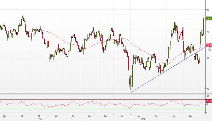 Il forte impulso direzionale di ieri ha portato inoltre l’indicatore RSI vicino alla soglia di ipercomprato e considerata la significatività del livello statico (e psicologico), sarà necessario attendere l’apertura di Wall Street per capire se il titolo sarà pronto ad attaccare quota 389 dollari.