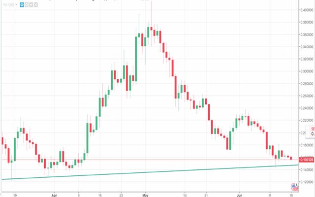 Ora i prezzi stanno ora cercando di trovare la forza per una ripartenza: la somma tra l’area di supporto statico a 0,1474 e il tocco della linea di tendenza ascendente che collega i minimi del 7 dicembre 2017 a 0,079754 a quelli del 18 marzo 2018 a 0,120618 potrebbe dare al Cardano il carburante necessario per tentare un nuovo allungo.