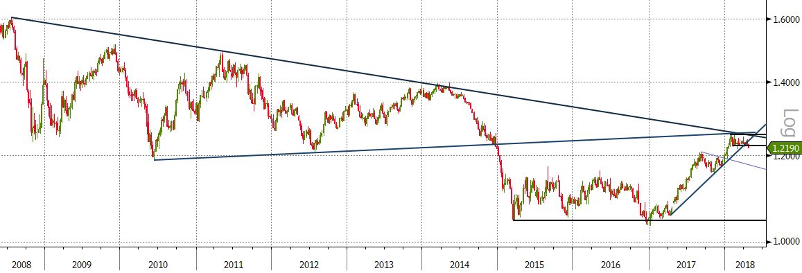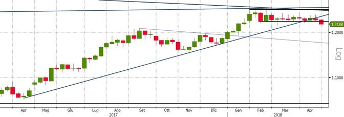 Spostando l’analisi su un timeframe settimanale la fase tecnica di inversione del cambio Eur/Usd appare ancor più chiara. Le velleità rialzista sulle quotazioni dell’eurodollaro sono state contenute nel corso del primo trimestre del 2018 dalla presenza della resistenza di matrice dinamica espressa sul grafico weekly dalla trendline di lunghissimo periodo che unisce i top di luglio 2008, maggio 2011 e marzo 2014.