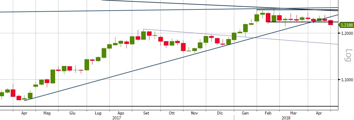 Si accentuano le pressioni ribassiste sul cambio Euro/Dollaro Usa con le quotazioni che questa mattina si sono appiattite a ridosso del supporto psicologico a 1,22 corroborando i segnali di debolezza generati la scorsa settimana a cavallo fra il 19 e il 23 aprile.