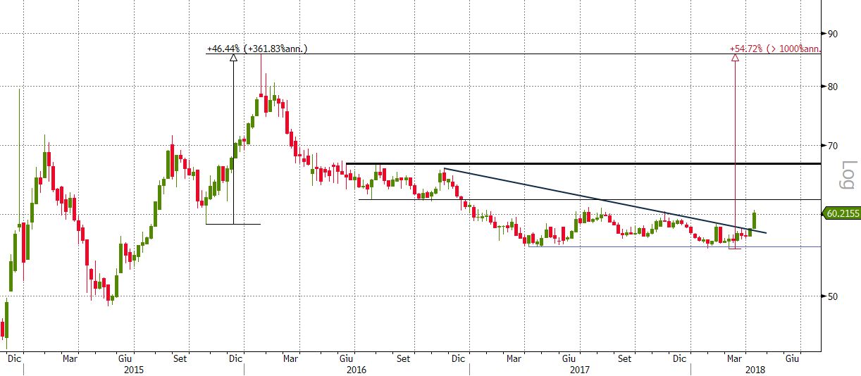Dopo circa 26 mesi di mercato orso il quadro tecnico del cambio fra Dollaro Usa e Rublo russo (Usd/Rub) sembra prossimo a voler disegnare un segnale di inversione rispetto alla tendenza di fondo, seguita ormai dal gennaio del 2016, mese che vide il cambio toccare il massimo storico a 85,9563 prima di imboccare la tendenza ribassista che dopo poco più di un anno ha portato le quotazioni Usd/Rub a danzare sopra i supporti statici fra 55,80 e 56. Fra marzo e aprile il cambio ha poi espresso un trend di breve/medio termine rialzista, descritto dalla trendline che supporta i minimi crescenti del 27 febbraio e 26 marzo 2018.