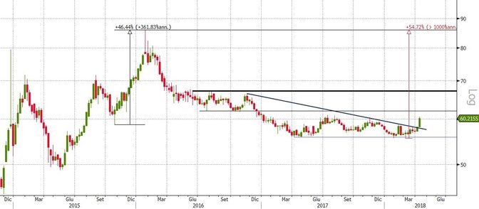 Oggi la candela rialzista disegnata sul daily chart dall’Usd/Rub non ha fatto altro che confermare quel segnale, portando i corsi del cambio prima oltre i precedenti massimi relativi del 2018 toccati il 9 febbraio a 58,7665 e poi sopra i 60. Importante sottolineare che il cambio si è lasciato alle spalle anche la media mobile a 200 sedute.