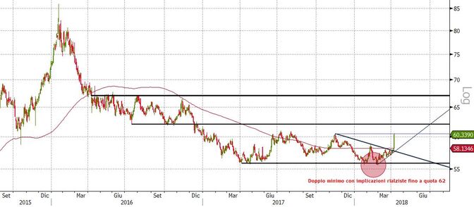 Dal punto di vista dell’analisi candlestick il movimento di oggi non fa che rafforzare le ipotesi d’inversione rialzista basate sulla figura tecnica in costruzione dal 25 gennaio scorso. Trattasi di un doppio minimo costituito dai low intraday delle candele del 25 gennaio e 27 febbraio 2018.