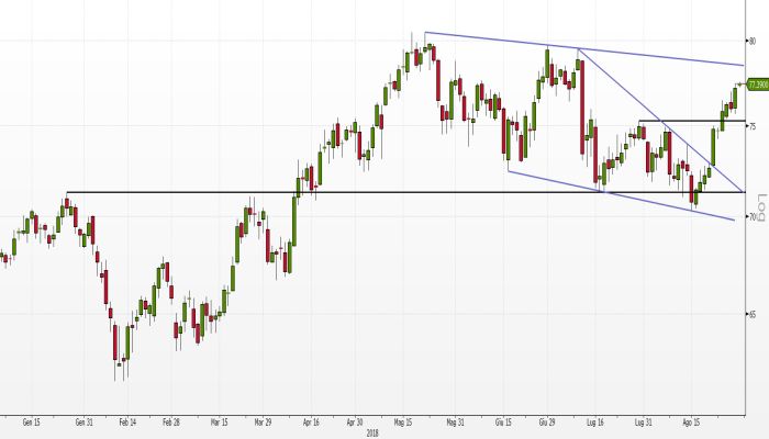 L’uscita dei prezzi dal pattern wedge discendente costruito nei mesi estivi ha rinvigorito le quotazioni dell’oro nero, che ora potrebbero anche dirigersi verso gli 80 $