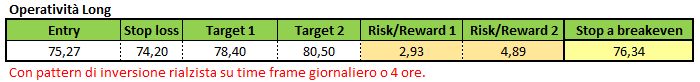 Il livello al quale prestare attenzione per un’operatività di natura rialzista potrebbe essere il supporto statico a quota 75,27 dollari, livello ereditato dal massimo segnato con la seduta del 30 luglio. Da quest’area un eventuale formazione di un pattern dalle implicazioni rialziste potrebbe rappresentare un semaforo verde per l’implementazione di posizioni long.