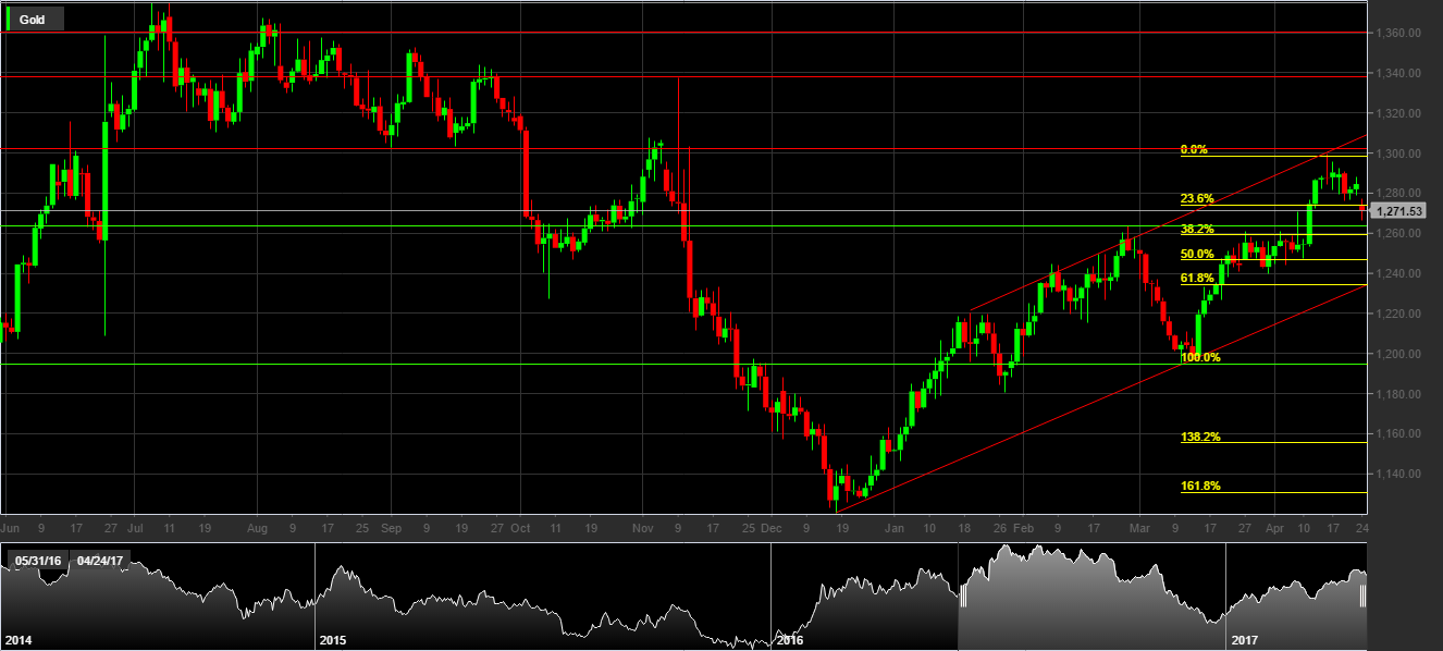 La quotazione dell’oro ha aperto in gap down questo lunedì, in scia alla notizia della vittoria di Macron al primo turno delle presidenziali francesi. I prezzi puntano adesso al test del livello di supporto posto in area 1.263$. La tenuta di questo supporto è determinante per una ripresa del movimento rialzista iniziato dal minimo del 16 dicembre 2016 a quota 1.120$, come mostra il canale rialzista evidenziato in rosso sul grafico daily sotto riportato.